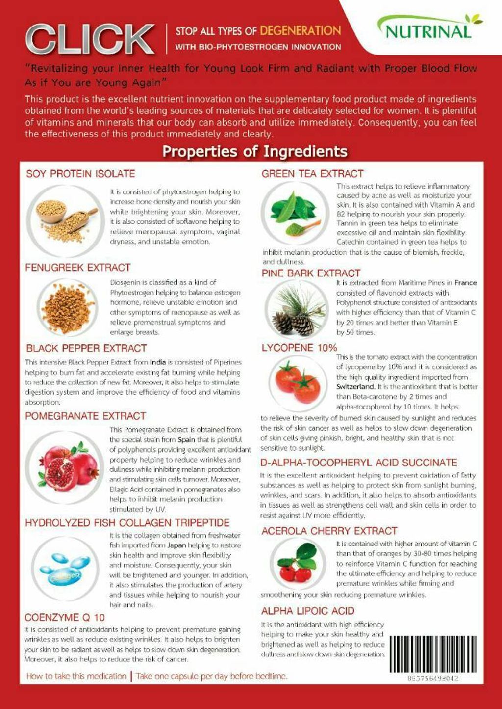 CLICK保健品采用世界顶级原料提取物,带来突破的营养,为女人挑选。身体能即时吸收及转化为丰富的维生素和矿物质资源。为你带来明显的效果。