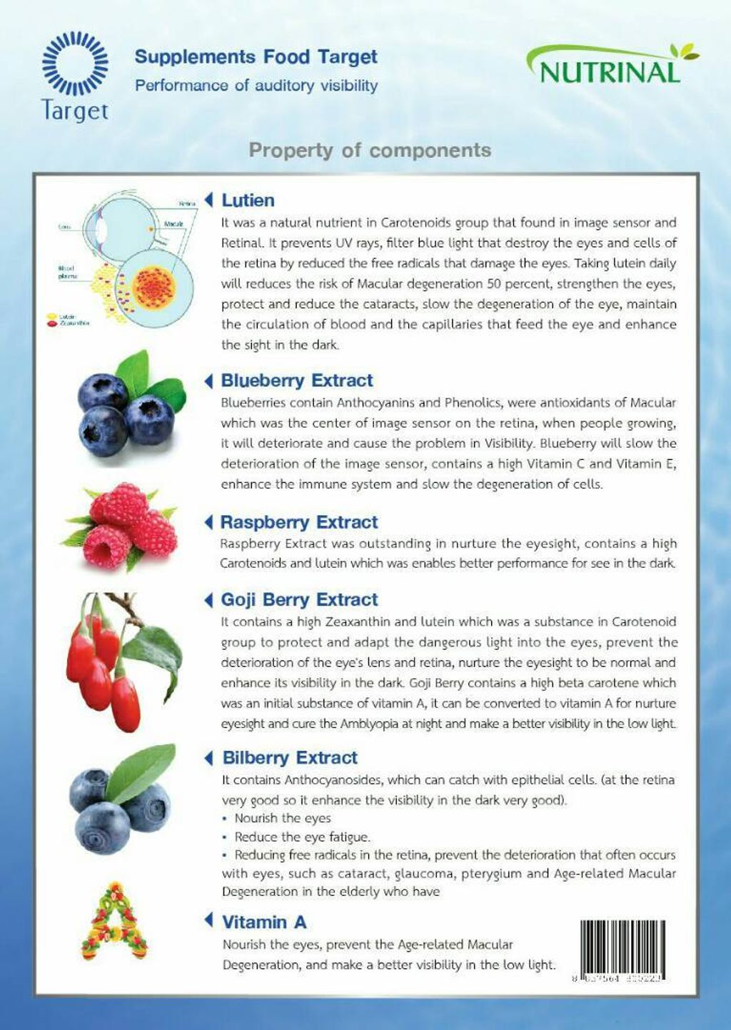 覆盆子提取物对滋养视力起巨大作用,含有高量的黄体素和胡萝卜素,提高黑暗中视力。